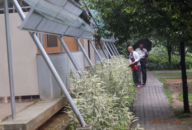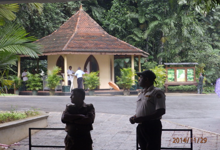 Итак, приехали мы сюда после осмотра храма Хиндагала где то часов в 10 утра. Небо заволокли тучки, шел мелкий дождик но было довольно тепло и комфортно, тем более мы были в предвкушении новых приключений. Наш гид Лашан повел нас к главному входу Ботанического сада и попросил немножко подождать, а пока он куда то исчез быквально на пару минут мы рассматривали витрины маленьких сувенирных магазинчиков на входе в сад и двух охранников, которые ревностно стерегут сад от "зайцев".