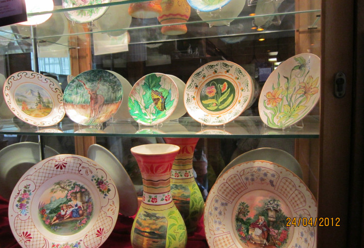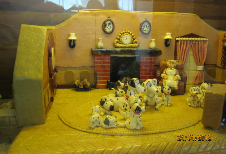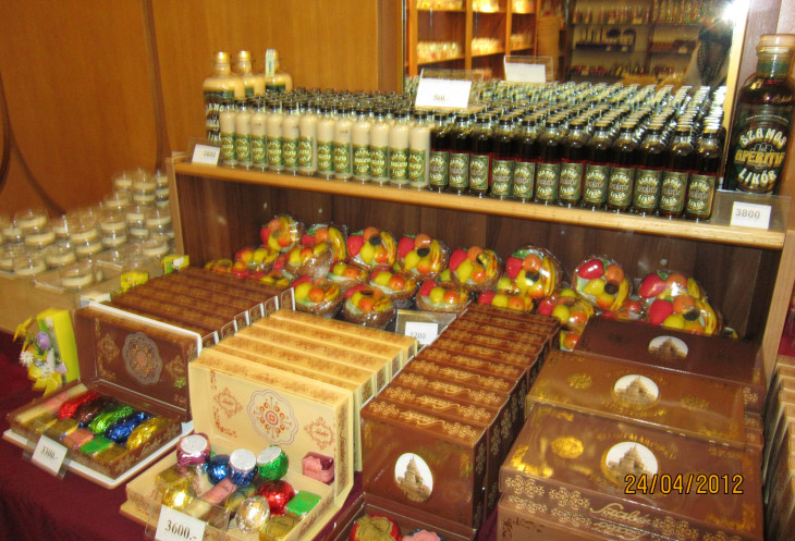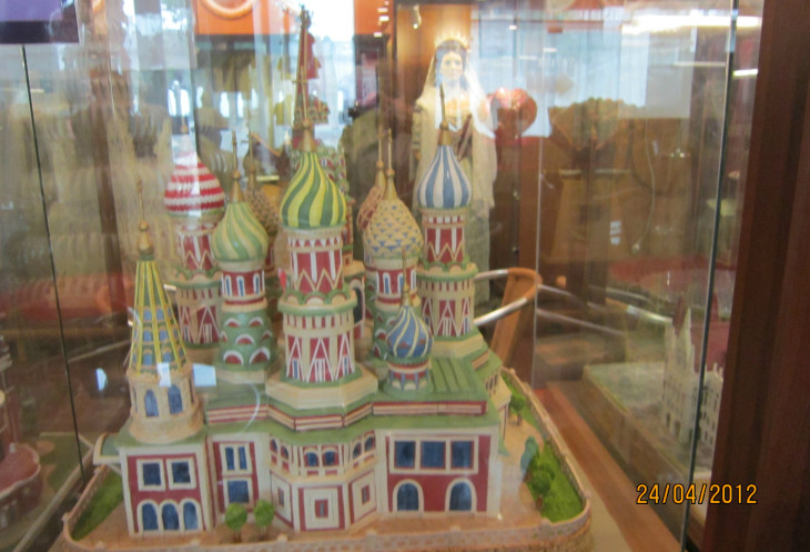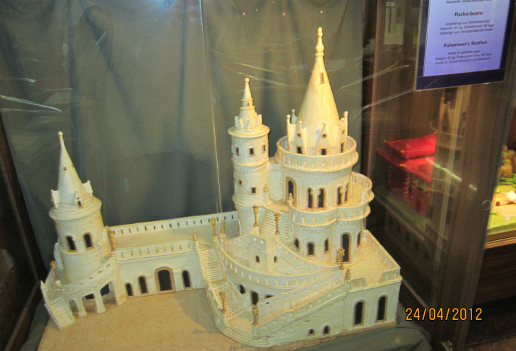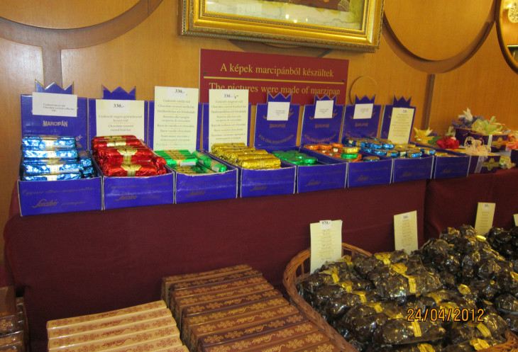 Конечно же, я потащила мужа туда. Вывесок особых нет. Мы были единственными посетителями, экскурсантам полагался бонус - бесплатный туалет, что для туриста немаловажно. Музей невелик - большая комната и поменьше. Но экспонатов достаточно: это и копии знаменитых сооружений, например, таких, как будапештский Цепной мост Сечени, здание Венгерского парламента, Храм Василия Блаженного, сценки из известных мультиков, портреты знаменитостей, изваяния растений, предметы быта и посуда, и даже фигура императрицы Сисси в полный рост; к каждому объекту - описание: сколько пошло марципановой массы, сколько времени изготавливали.