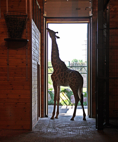 А вот у жирафа весь вольер выходит на солнечную сторону, поэтому он выходил из своего дома буквально на секунду и снова возвращался в тень помещения.