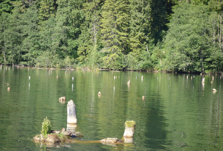 Еще один бонус от Валентина — посещение не упомянутого в программе озера Красное. Вот умеют люди «из ничего» сделать популярный туристический объект! Озеро образовалось из-за обвала скал после сильных ливней в 1837 году, в результате теперь из воды торчат стволы мертвых деревьев. Вроде бы из-за приносимых питающими озеро речками аллювиальных формаций у озера красноватая вода, но нам вода показалась зеленой — в ней отражались окрестные горы. Так ведь придумали легенду о воре, похитившем красавицу, которая не хотела оставить ушедшего в армию жениха и взмолилась о помощи к небесам, которые и послали это стихийное бедствие. В общем, все умерли. Эта легенда написана на стендах у озера на нескольких языках, в т.ч. на русском, что совсем не характерно для Румынии. Около этого озера куча кафешек и развлекательных аттракционов, народ сюда приезжает семьями. Я сразу вспомнила Усть-Илимское водохранилище с торчащими из чистейшей воды стволами деревьев, у которого мы ночевали на дебаркадере в незапамятные времена. Вот где тишина и покой!