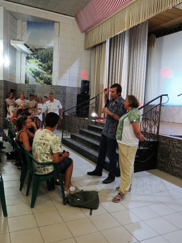 Пока ждали заполнения зала и назначенного времени, успели пообщаться с персоналом. Оказывается, в этом лагере отдыхают дети от 7 до 18-ти лет. Неожиданно, в наше время в пионерлагерь брали до 14 лет. Лагерь работает уже более 60-ти лет, есть свои устоявшиеся традиции. Одна из них- встречи детей с интересными людьми.