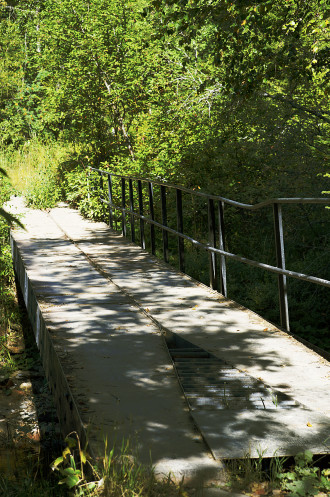 Перейти можно по мостику,а можно и по камням,которых много накидано в речке.