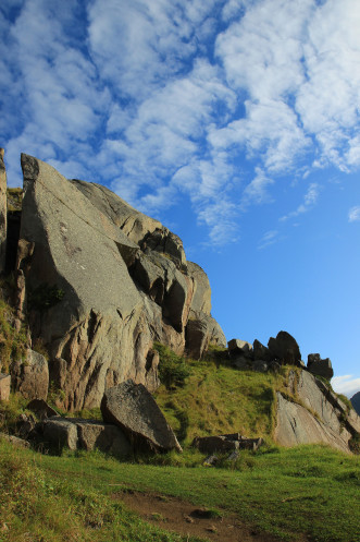 Слева обрыв, справа крутой склон, хоть и в основном травянистый, но неприятно было бы по нему скатиться. Гребень в основном относительно пологий, но местами перегорожен крупными камнями и скальными выходами;