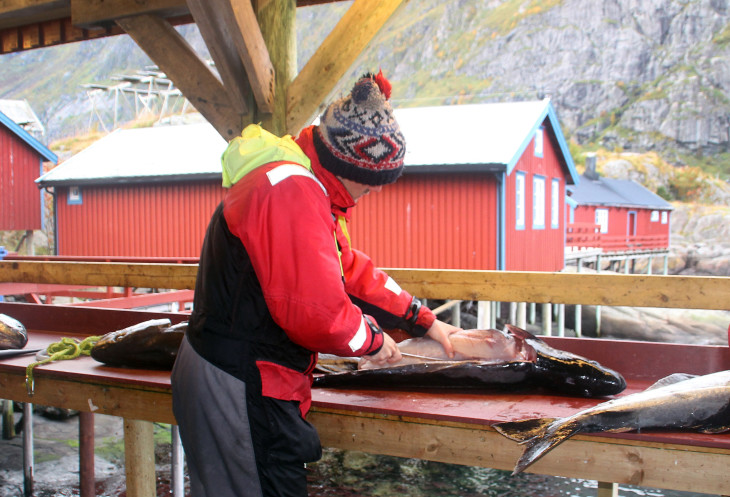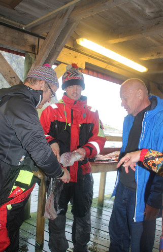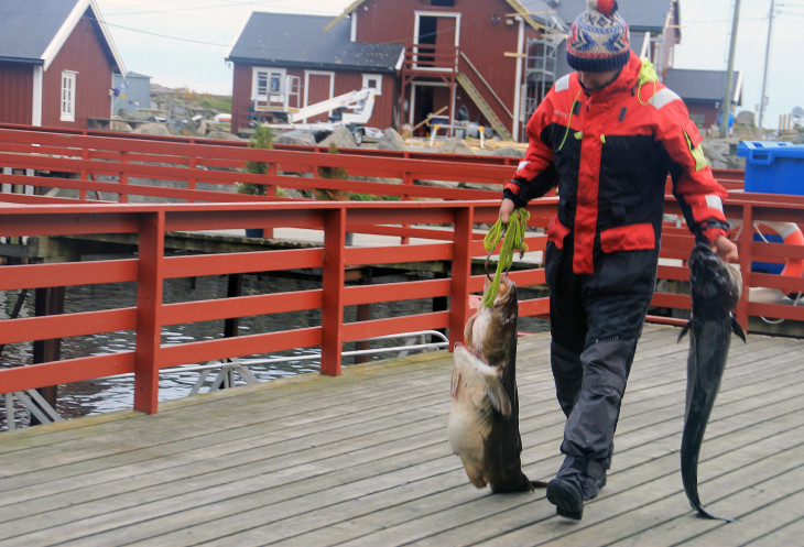 Пока я разыскивал ресепшен нашего кемпинга, а он оказался метрах в 150-200 от спальных домиков в каком-то кафе, пока оформлял проживание, девчонки нашли себе зрелище покруче и поэкзотичнее. Прямо возле них причалил небольшой катер и молодой норвежец принялся вытаскивать из него солидных рыбин и носить мимо наших девушек
