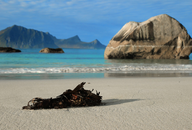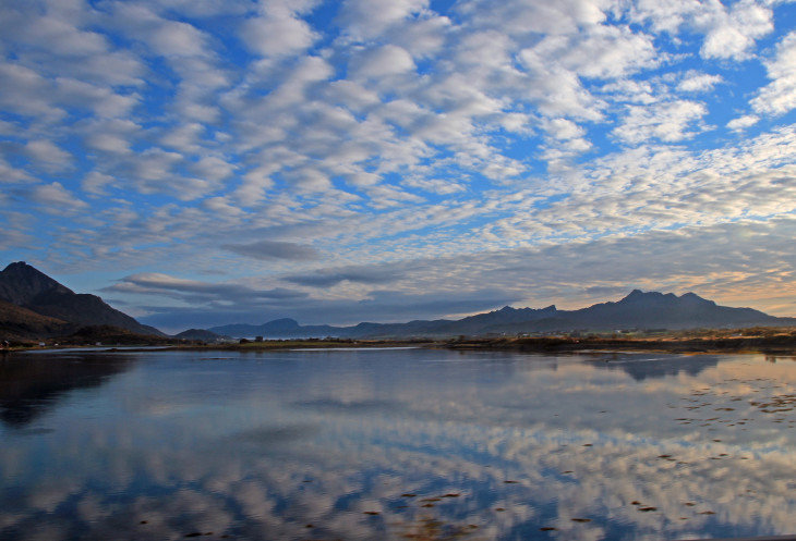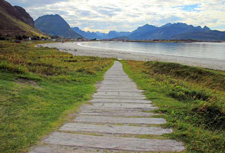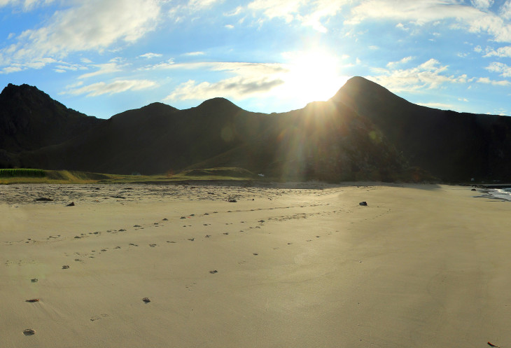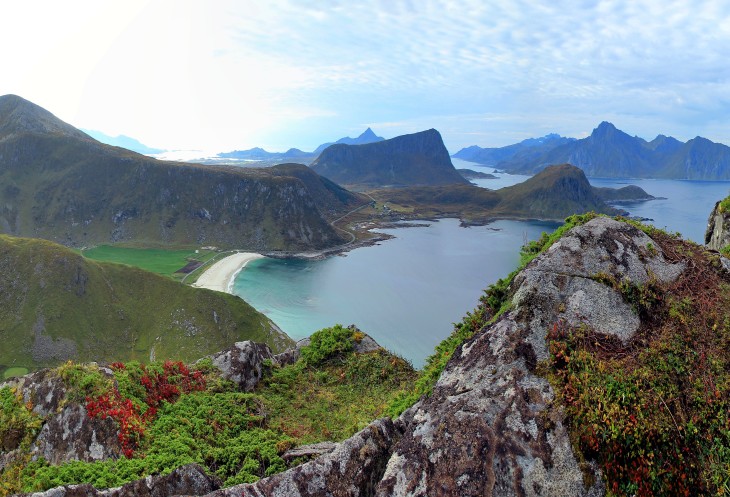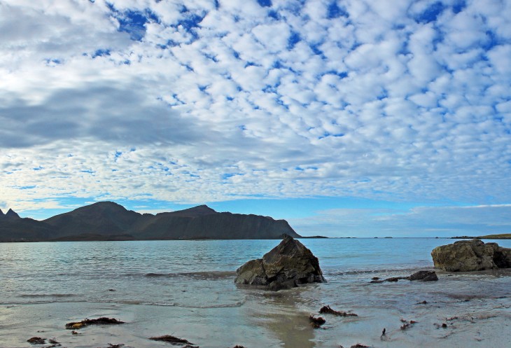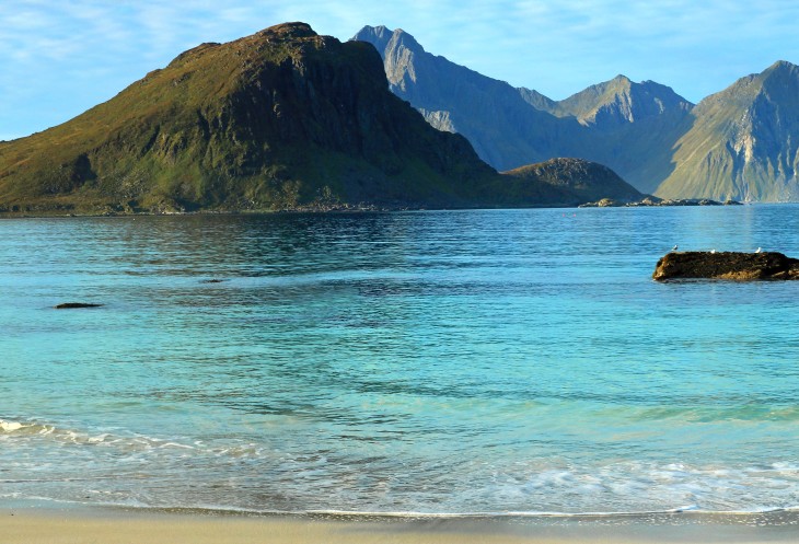 Пляж Хаукланд с белоснежным песком и лазурной прозрачной водой считается одним из красивейших пляжей Лофотенских островов. Он состоит их двух песчаных кос.