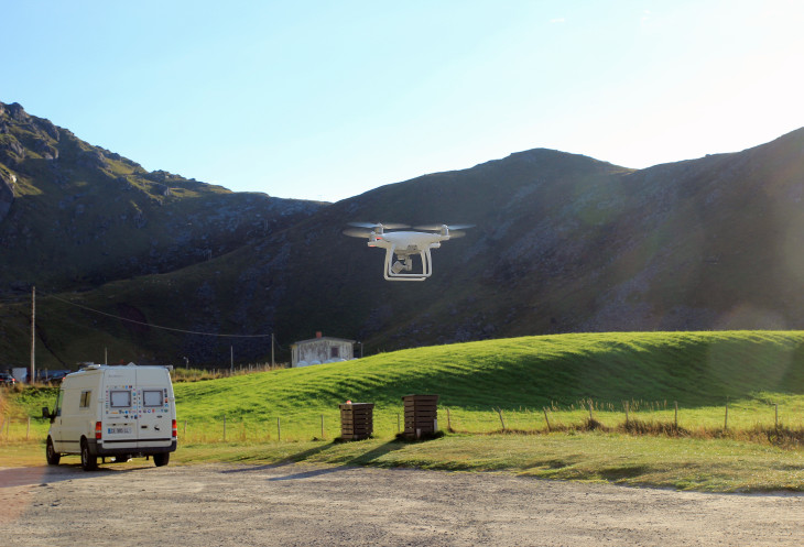Недалеко от нас останавливается автомобиль из которого выходит молодой человек и запускает в небо квадрокоптер с видеокамерой на борту.