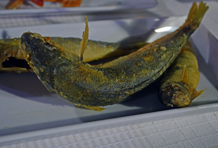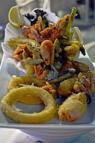 Уже все ! Ничего больше не лезет!!! Думаем это конец. Откинулись на стульях,пьем сок... И тут - та-даам еще одно блюдо,наполненное мелкой рыбкой,креветками,кольцами кальмаров...