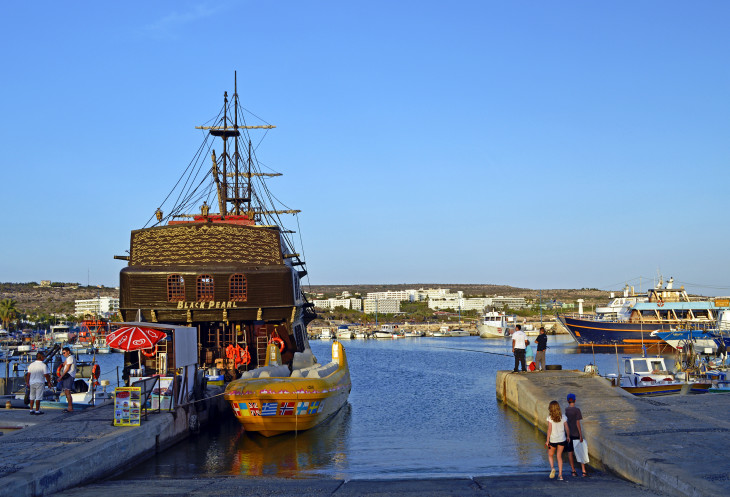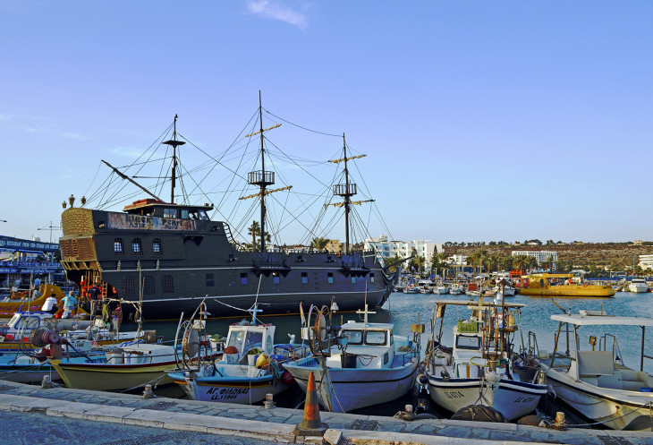 Дальше пристань,где швартуется знаменитая шхуна - "Черная жемчужина",ежедневно катающая туристов к пиратским пещерам и мысу Греко.