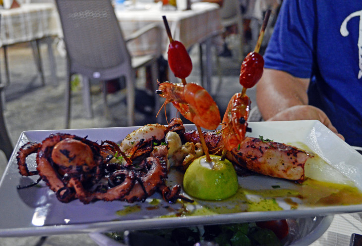 Обедать ходили в основном в таверну,рядом с отелем. Готовят вкусно,порции большие.Брали национальные блюда,чек выходил от 18 до 25 евро на двоих (напитки не брали) .Иногда оставляли сдачу на чаевые.