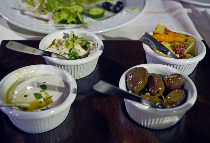 Рыбное мезе это блюдо,которое нельзя описать в двух словах. Потому,что это целое представление блюд.Как бы вы не готовились и не читали описания,все равно всегда и в разных тавернах будет по разному.)) Так случилось и с нами. Сначала принесли заказанный сок. Потом огромную тарелку с греческим салатом и хлеб. Я еще подумала,что хлеба пожалели,принесли по два кусочка))). Потом пошли маленькие чашечки с разными соусами и закусками.