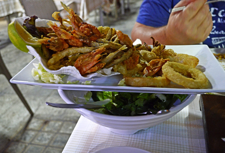 А мы же после купания да после длительной прогулки вдоль берега-голодныеее! Каак налегли! ))) А дальше несут креветки в соусе,каракатицу,кальмаров,барабульку,мидий, осьминогов ... Еще гарнир: чашку риса и чашку картофеля фри... Потом огромную рыбину Дорада и еще что то вкусное!