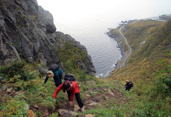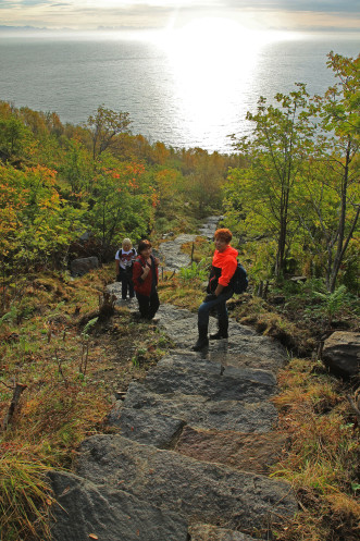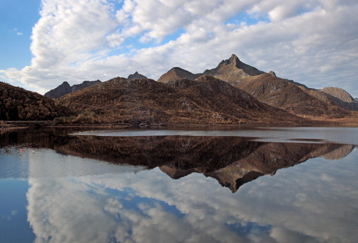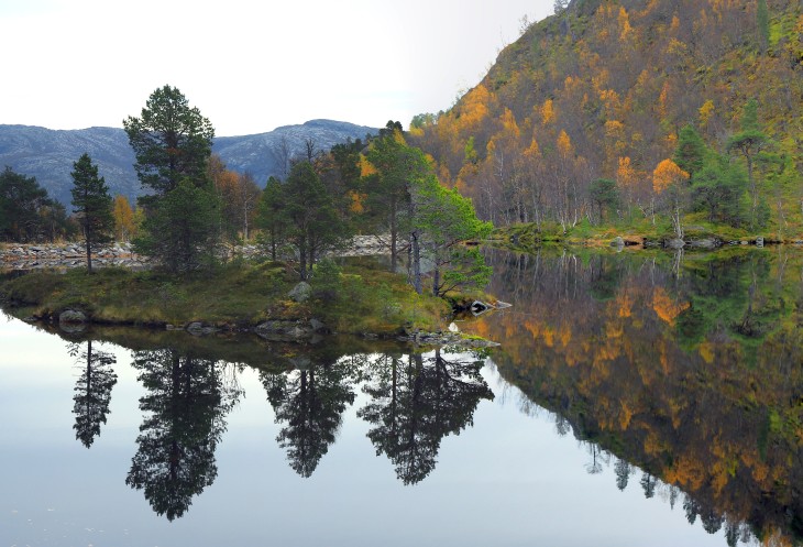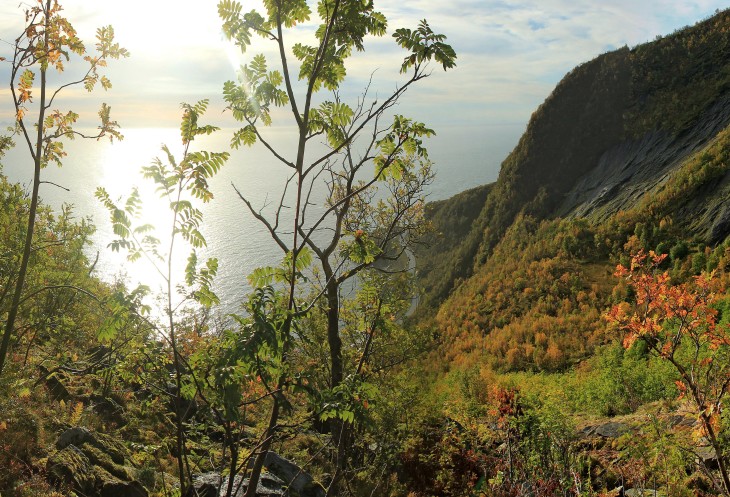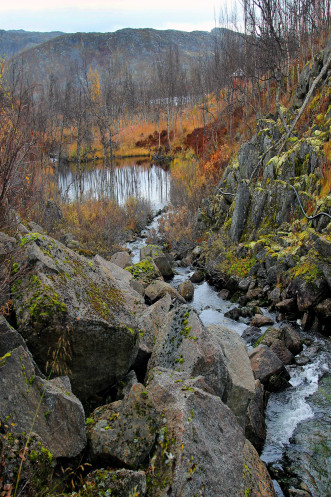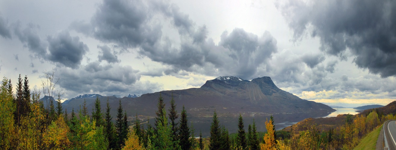 Далее потихоньку начинаем забираться в горы, по которым проходит граница со Швецией. На пути на острова, в первый день нашей поездки, мы проезжали здесь при ярком солнце и не переставали восхищаться пейзажами, но тогда торопились успеть засветло. А вот сейчас облачно. Не пасмурно, но солнца нет, и некоторые места даже не узнаем, хотя все равно, красиво!