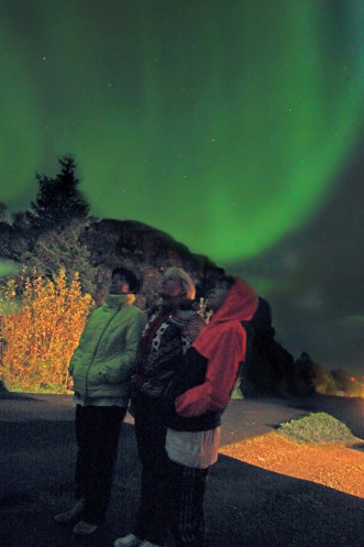 Бужу девчонок и предлагаю им полюбоваться стихией и даже выйти и сфотографироваться на фоне сияния. Идея, как ни странно, воспринимается с воодушевлением и через пять минут мы уже стоим на дороге возле нашего домика пытаясь сфотографироваться. Пробую со вспышкой, но видно только людей на очень темном фоне и никакого сияния. А если без вспышки, то выдержка с моей не профессиональной техникой нужна не менее 10 секунд. Попробуйте постоять не шелохнувшись 10 секунд!