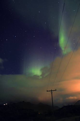Выскакиваю, делаю несколько снимков на которых четко видно, что в просветах над низкими облаками, подсвеченными ночными огнями городка Кабельвог, разыгрывается воистину грандиозное зрелище.
