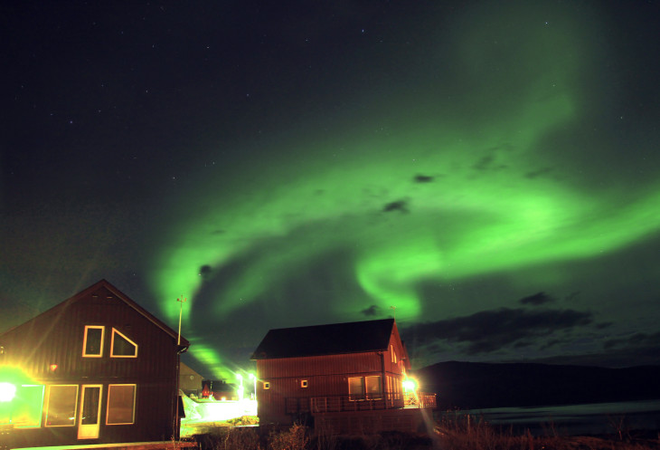 За ужином распиваем последнюю бутылку виски, и с удовольствием вспоминаем всякие разные моменты нашего путешествия. По привычке, Вера смотрит прогноз Северного Сияния, и он оказывается более 30%! Более того, сегодня ожидается Сияние силой около 6 баллов, а все предыдущие были по 3-4 балла! Выглядываем в окно, небо, хоть и чистое, но темное. На всякий случай готовлю аппаратуру, перед тем, как завалиться спать. И пока я ее готовил, пока укладывался спать, за окном на небе начали проявляться зеленоватые полосы, сначала бледные и плохо заметные, потом все ярче и ярче!