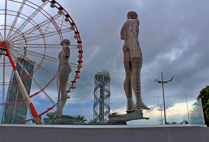 Инсталляция на набережной города Батуми под названием «Али и Нино» представляет собой две движущиеся фигуры мужчины и женщины, которые за 5-10 минут успевают слиться в поцелуе и разойтись, проходя друг через друга.