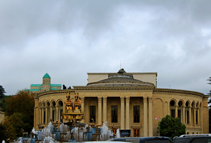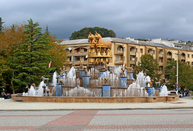 Съехав утром с квартиры в Батуми, мы отправились во второй по величине (после столицы) город Грузии – Кутаиси. Припарковав машину в центре города, мы вышли осматривать исторический район столицы Имеретии. В центре большой проезжей площади возвышается многоярусный фонтан со статуями рогато-копытных животных. Огромное каскадное сооружение иллюстрирует мифы о древней Колхиде.