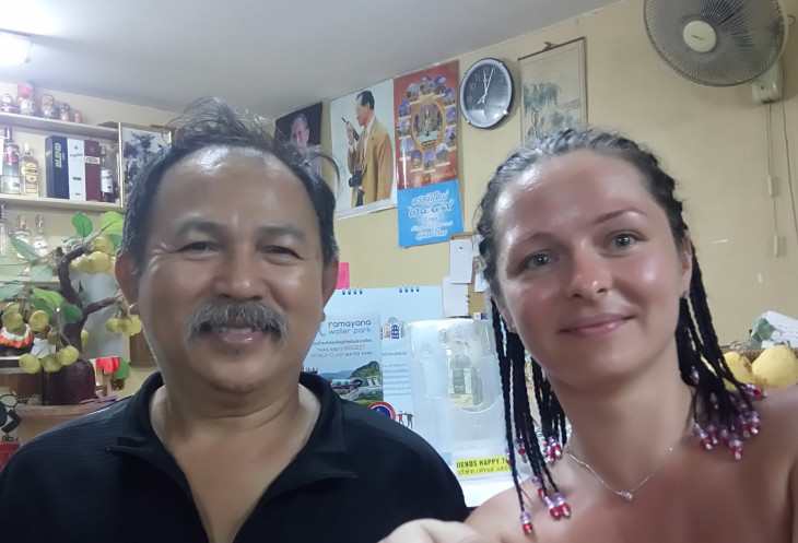 Еще в далеком и таком уже туманном 2012 году довелось нам познакомиться с отличным «питательным» местом (а также выпивательным и расслабительным). Спустя 5 лет кафе мало чем изменилось. Подушечки новые, кое-где покрашено заново, цветочки другие, да и вазоны, по всей видимости, новые. В остальном все по-прежнему. Так же вкусно, также дешево. Тот же хозяин – Той. Вот только дочки его выросли. Помогают папе в зале с посетителями.