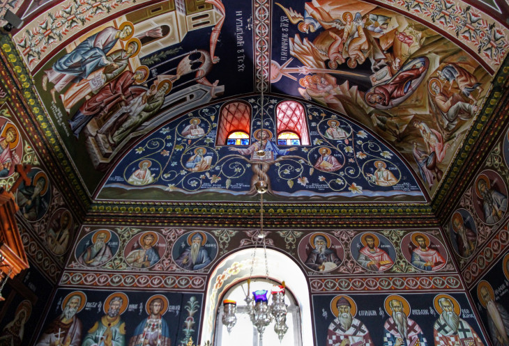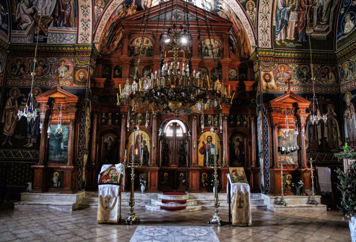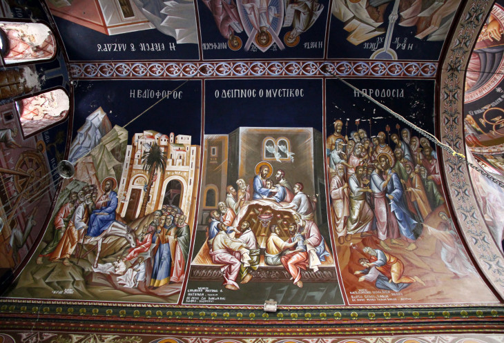 Но конечно, люди там все же были. Монахов мы не нашли, зато встретили бабушку и дедушку, которые, как я понял, и наводят на территории всю имеющуюся там красоту. Увидели мы их не сразу, сначала услышали - бабушка начала что-то громогласно втолковывать тугому на ухо дедушке :) Птичье пение ушло на второй план :) Территория монастыря совсем небольшая, и мы ее быстро изучили. А на дверях главного храма висел замок с торчащим в нем ключом. Но было непонятно, можно ли туда зайти... Походили-походили вокруг да около, и по российской привычке решили сами замок не открывать. Попробуй в нашем монастыре влезть в место, которое под замком :) И тут, на наше счастье, во дворе монастыря появился какой-то критянин. На монаха или священника он похож не был, скорее на какого-то "хозяйственника", но вел себя в монастыре как дома. Вот у него я и решил испросить разрешения на то, чтобы открыть замок. По-английски он не понимал, но универсальный язык жестов помог нам преодолеть языковый барьер. "Да, конечно!" просемафорил он руками и сам открыл нам дверь. Какая красота, и мы чуть не лишились удовольствия созерцать все это!