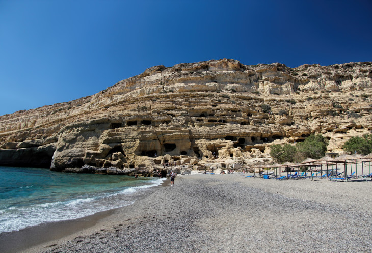 Во время планирования маршрута я предполагал, что мы припаркуемся в Матале где-то на подступах к пляжу на бесплатной парковке. Но жизнь внесла свои коррективы. Все ближние подступы были плотно заставлены машинами, а издалека тащиться на пляж после прогулки по Гортине и двум монастырям, (а в особенности - после обеда) - очень уж не хотелось :) Поэтому решили не жалеть пары евро и зарулили прямо к пляжу. Самое интересное, что, при таком количестве припаркованных машин, людей на пляже оказалось совсем не много. И где они все, по пещерам сидят, что ли ? :)