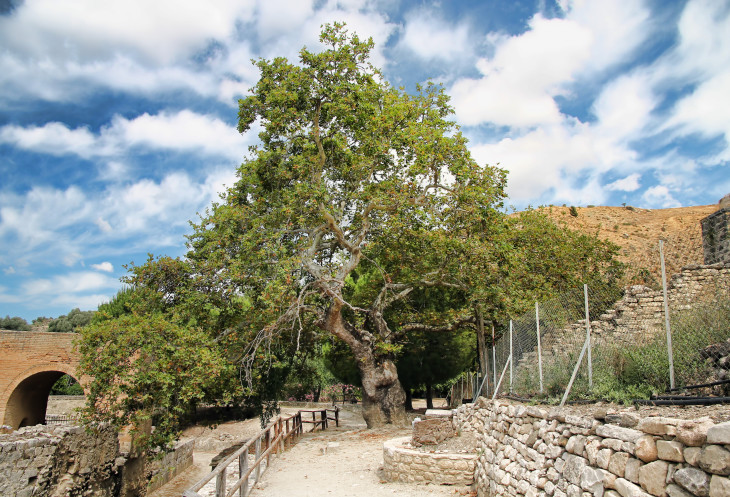 Далее до самой археологической территории ничего особенного не происходило. Не очень интересные пейзажи (кроме как в районе поселка Агия Галини), городок Тимпаки с тягучим движением, ремонт дороги... И вот, наконец, мы у Гортины. Туристов пока еще не много, это для съемки хорошо, но вот небо еще не совсем очистилось - это, конечно, не очень... Но, как оказалось, снимать в Гортине особо и нечего, я почему-то ожидал большего, особенно когда цена за вход - 6 евро :) Как ни странно, в этом месте мне больше всего понравились старые деревья. Впечатлили.