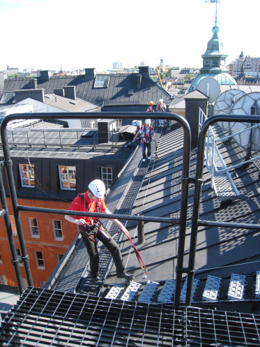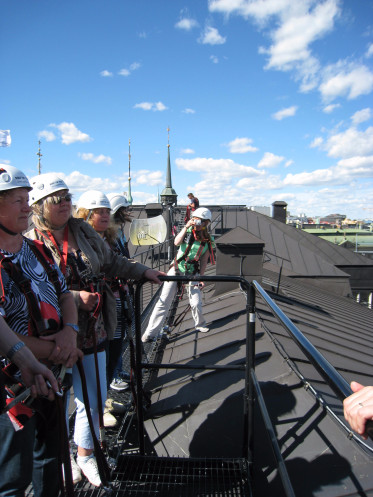 На вопрос о стоимость экскурсии, нам объяснили, что в нее включены плата за аренду крыши, работы по прокладке пандусов, аренда снаряжения (альпинистская обвязка, каски, крепления, дополнительная теплая одежда, накидки от дождя, на случай если возникнет необходимость) и работа сертифицированного гида. Гид особо подчеркнула, что все крепления отвечают требованиям безопасности, установленным ЕС. Все съемные части креплений одобрены европейским стандартом и имеют маркировку ЕС. Гиды имеют сертификат по технике безопасности при работе на высоте, а также владеют техникой сердечно-легочной реанимации. В общем, выжить и вернуться на твердую землю, – другой альтернативы у туриста нет.