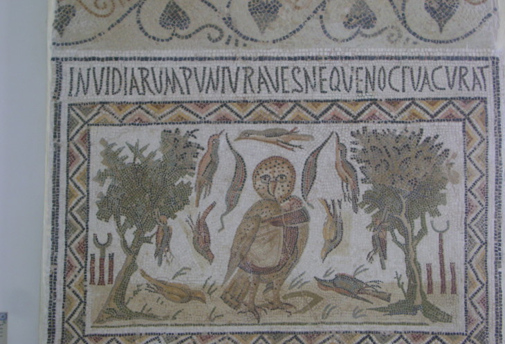 Экскурсовод заостряет наше внимание на знаменитой картине из мозаики "Сова и мёртвые птицы". На полотне есть надпись на латыни, которая переводится примерно так: "Завистливые дохнут от своей желчи, а мудрой сове всё равно!".