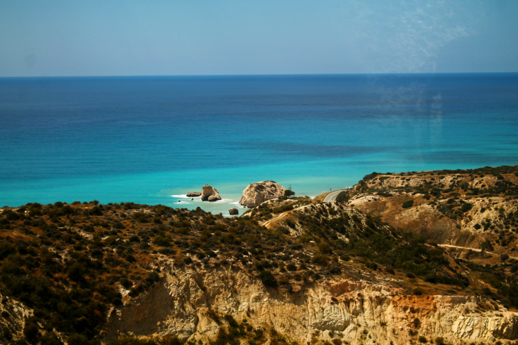 Следующая достопримечательность по пути в Пафос, которую могут посмотреть те, кто в Пафос едет на машине - это знаменитая Скала Афродиты, Петра-ту-Ромиу. Таким, как я, которые ездят на автобусах, остается только любоваться на него в течение буквально минуты, пока автобус проносится по трассе мимо... Одна из самых впечатляющих картин из окна автобуса на этой трассе. Цвет воды - реальный, фотошопом только добавляла контраста.