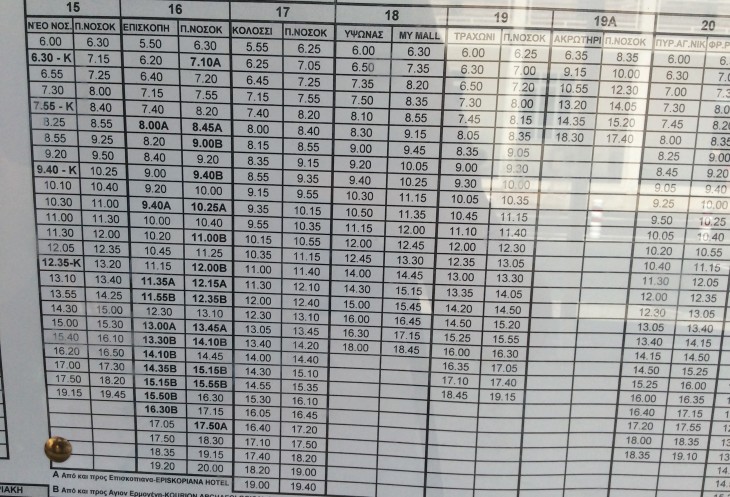 Чуть больше часа идет дневной автобус до Пафоса (обратный вечером - без пяти минут час). Междугородние автобусы приходят на "верхнюю" автостанцию с красивым названием "Каравелла". Но, по сути, это просто площадь с автобусами, здесь нет даже здания автостанции! Билеты продают в какой-то будке, расписание - яркое, цветное - на большом фанерном щите. И так - не только в Пафосе. Это вообще кипрская особенность - они не заморачиваются инфраструктурой, сопровождающей автобусные перевозки)