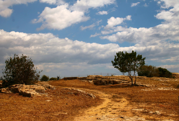 В северной части холма - относительно ровная площадка, с окантовкой из вертикальных невысоких скал по краям - как будто когда-то кем-то здесь вырыт был большой котлован... (Что очень даже может быть - ведь камень, из которого в Пафосе строили ли дома, вряд ли возили откуда-то издалека...)