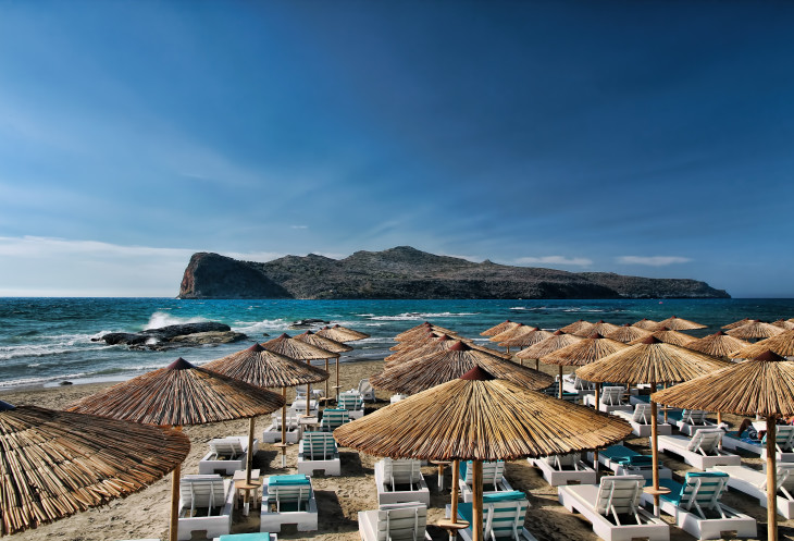 Симпатичный, отлично оборудованный пляж, довольно многолюдный. Наверное, самый многолюдный из тех, на которых мы побывали за весь отпуск на Крите. Свой походный зонт мы брать не стали, и правильно - воткнуть его там все равно было бы некуда. Заказали какие-то напитки, чтобы не платить за шезлонги, и отправились купаться. Вид тут, конечно, шикарный...
