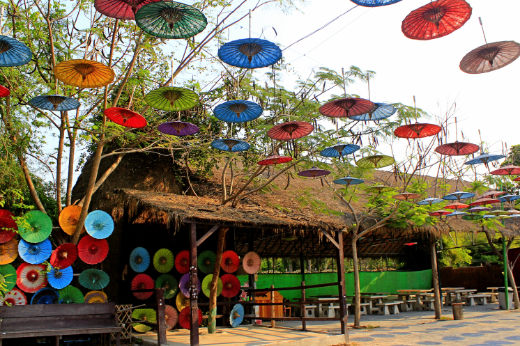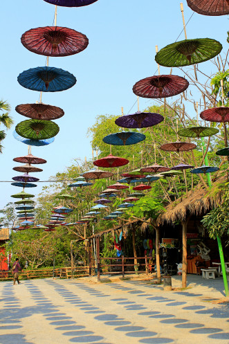 Разноцветными зонтиками украшен вход в Деревню длинношеих женщин Карен. На территории деревни водятся крокодилы, которых туристы могут покормить.