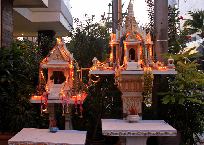 Начну с небольших храмов, которые повсеместно установлены каждым уважающим себя тайцем. Не смотря на то, что страна преимущественно буддийская, тайцы разделяют анимистические верования и свято верят в духов (не только в духов умерших, но и в духов природных явлений). Повсеместно можно увидеть опоясанные лентами большие деревья, цветы на носу лодки или машины, специальные домики для духов и т.п. Все это - элементы подношения, задабривания и выражения почтения духам.