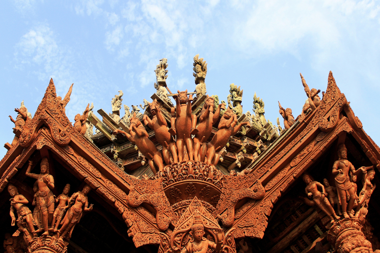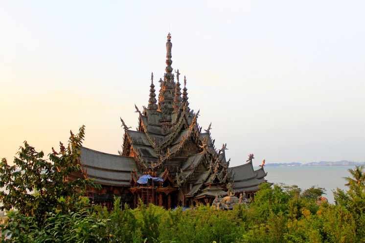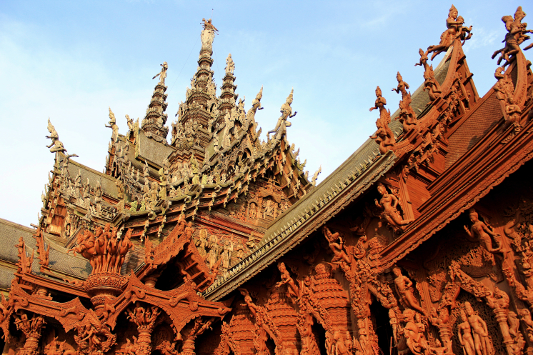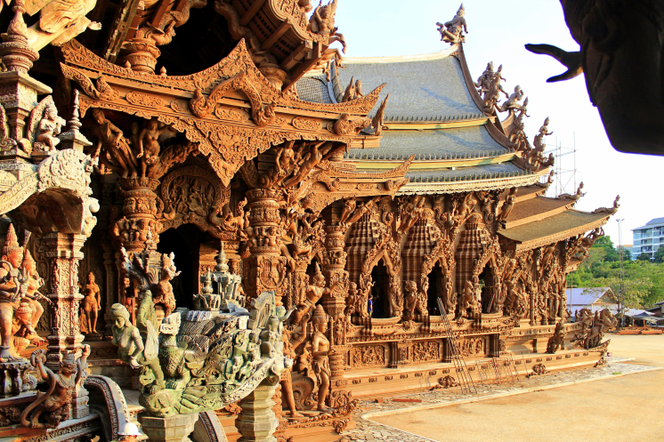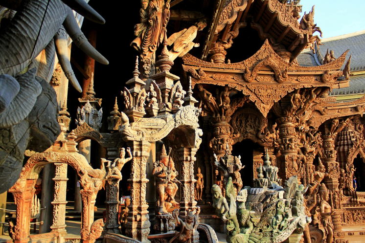 Помимо всего прочего, храм истины - самая высокая в мире конструкция, при строительстве которого использовалась древесина ценных пород. Сооружение пестрит резными скульптурами персонажей буддийской религии, животных и растений. Храм поделен на четыре тематических зала: Индия, Китай, Камбоджа и Таиланд.