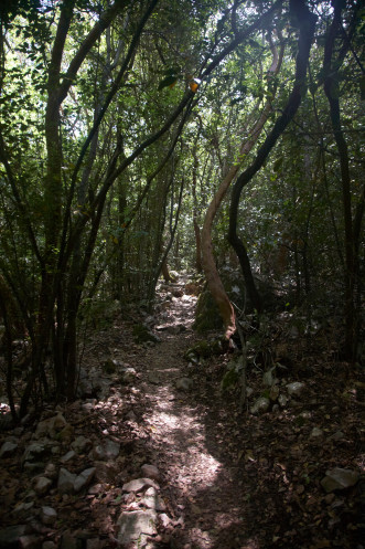 От Олимпоса до Адрасана тропа идет через верх мыса – сначала поднимается на 800 метров, а потом спускается обратно к морю. Тропа здесь гораздо хуже, чем была в горной части – часто встречаются поваленные деревья, ветки, какие-то кусты, которые приходится обходить, облазить, проползать: сразу видно, что Сулеймана здесь нет. И лес здесь совсем другой, чем был в горах. Там был светлый сосновый, иногда с крупнолиственными деревьями. А здесь настоящие джунгли – все ветки перепутаны, стволы деревьев кривые и гладкие, а внутри темно и сыро. И не видно ничего вокруг, кроме этих самых джунглей.