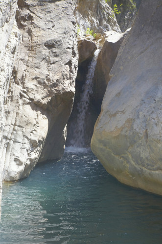 Говорят, лучший способ посмотреть каньон – это боди-рафтинг: платите деньги, надеваете гидрокостюм и проходите каньон по воде. Но у нас платить было некому, да и не очень мне туда хотелось – с фотоаппаратом я туда нырять не рискну, а без него буду только расстраиваться. Поэтому снизу поднимаемся по воде без всяких гидрокостюмов, до тех пор, пока воды в реке по пояс, а не по уши и можно пройти безопасно для фототехники. Но даже здесь очень красиво – голубая вода, светло-желтые камни и скалы, окатанные водой. Вода, конечно, холодная, но не так чтобы страшно – вылезти на берег заставил не холод, а острые камни под ногами – о тапочках я почему-то не подумала.