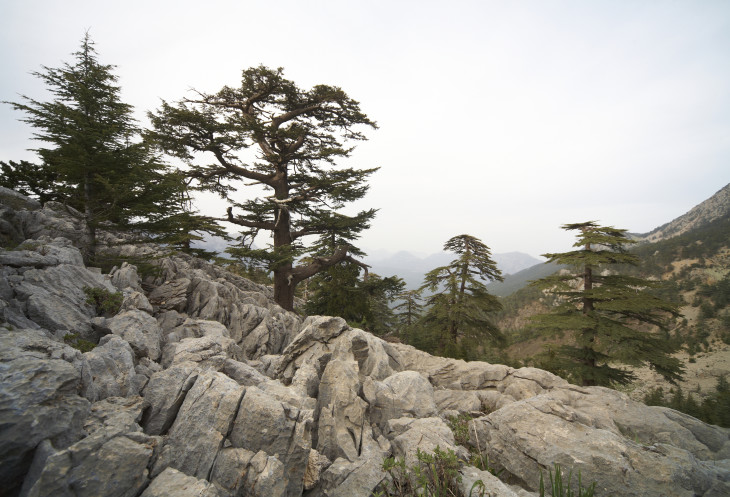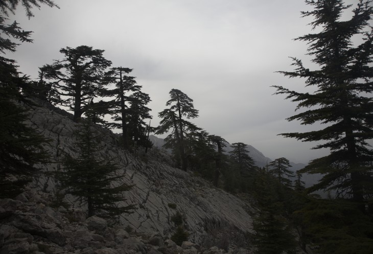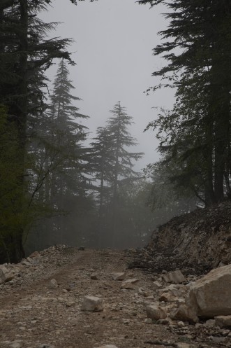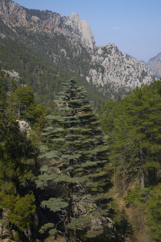 После Хисарчандыра тропа идет вверх по грунтовой дороге. Почти сразу мы оказываемся окружены высокими горами, на дальних вершинах лежит снег, на очень крутых скалах стоят огромные сосны, а еще какие-то елки-лестницы, про которые пишут, что это ливанские кедры.