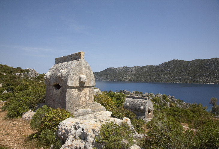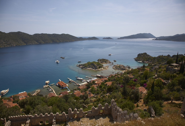 Наша сегодняшняя цель – ликийский (а потом и римский) город Симена. Он находится на горе прямо над морем. На той самой морской экскурсии его смотрят с моря, но получается как-то издалека. А тут можно подняться, походить между саркофагами, подняться по Римской дороге в крепость, и увидеть далеко под ногами море.