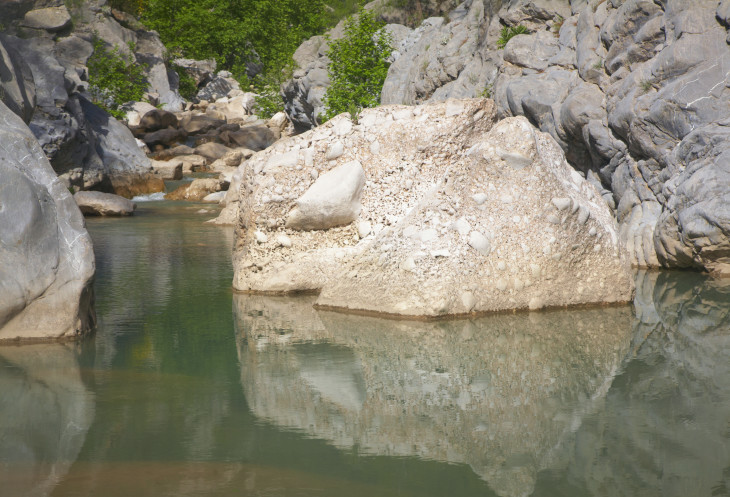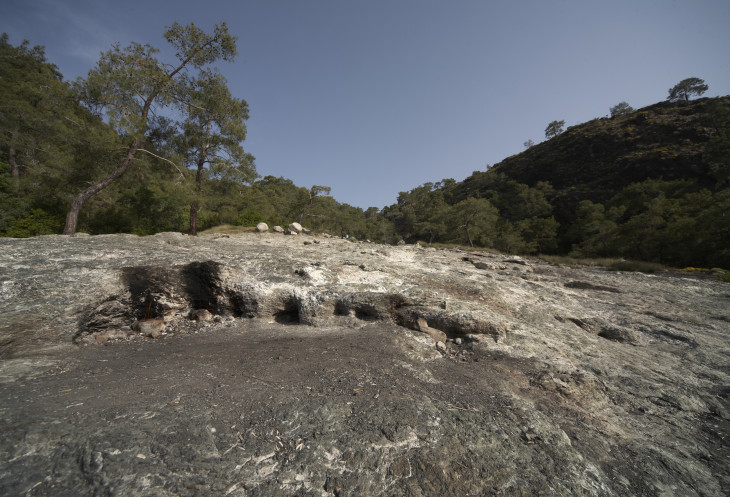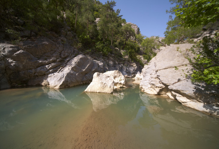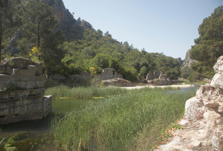 По этому самому пляжу идет тропа к руинам древнегреческого Олимпоса. Пока мы шли по пляжу, мы все никак не могли понять, где же здесь может спрятаться город. А он оказался вытянут прямо вдоль реки и скрыт между скалами, так что видно его становится, только когда подойдешь вплотную.