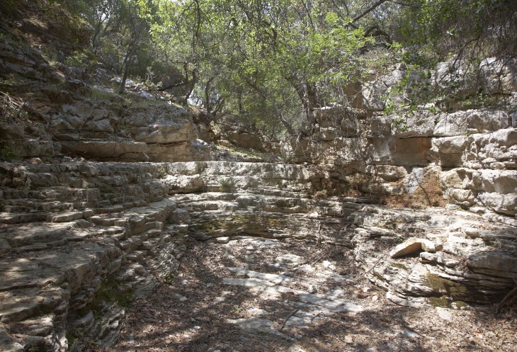 Но потом тропа уходит со склона в сухое русло реки. А там что-то вроде каньона – река выдолбила себе огромные ступени и амфитеатры в слоистых породах, которыми сложены эти горы. Остается только удивляться, куда мог деться такой мощный поток. Но воды нет.