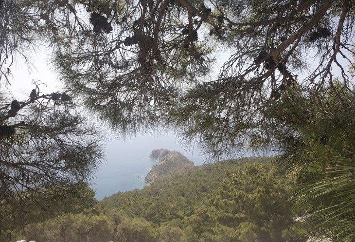 В Адрасане многие группы заканчивают свой маршрут. А, на мой взгляд, впереди – одно из самых красивых мест маршрута – мыс Гелидония. По мысу тропа идет вдоль моря, но достаточно высоко – над скалами и небольшими мысами. Но все равно, когда деревья расступаются, становится видно море, и острова, и скалистые берега. Вот только все опять тонет в вездесущей дымке.