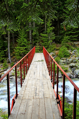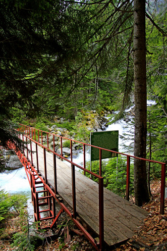 По подвесному мосту через реку Теберда нам необходимо было пройти на другой берег, но мост к сожалению был закрыт замком. Мы все таки нашли лазейку и перебрались на мост через булыжники в реке.