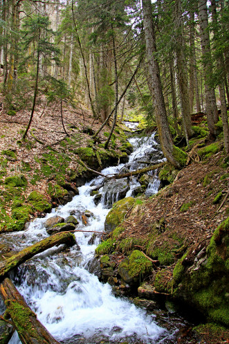 Экологическая тропа на Бадукской горе вела вдоль речки поменьше, но по мере набора высоты склон становился все более крутым. На пути нам встретился подтянутый мужчина, судя по всему гид-проводник казахов. Он нам сообщил, что дошел с оставшимися двумя казахами только до первого озера. Путь был сложным, т.к. снег местами не оттаял, поэтому дальше они не рискнули продвигаться. По его словам дальше первого озера снег был по колено. Пожелав нам удачи, он пошел догонять первых двух казахов, а мы двинулись дальше.