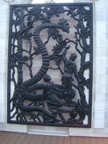 Чугунные панно "Великий полоз" и "Данила-мастер", укреплённые на стене, с любовью выполнены каслинскими мастерами чугунного литья.
