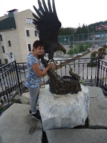 И ещё один подарок был преподнесён нашему городу пермскими кузнецами - скульптура "Орлица, кормящая птенца рыбой". Интересно, какое желание загадывает Маргарита, поглаживая большую рыбу, находящуюся в крепких когтях орлицы? А ещё есть традиция, что гости (особенно на свадьбах!) оставляют монеты в клюве птенца или в самом гнезде.