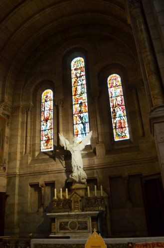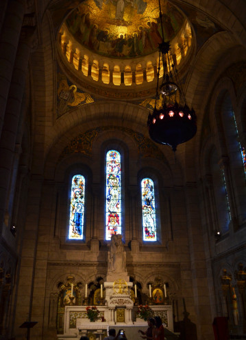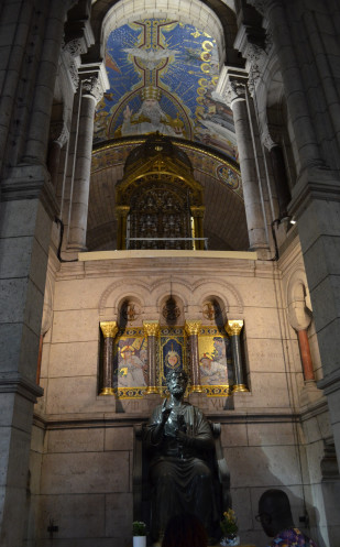 Вот мы и на вершине Монмартра, у входа в Базилику Сакре-Кёр, или Святого Сердца. Вобще-то мы читали, что она должна быть белоснежной, но видимо дождь подмочил её до серого цвета))). Высота главного купола 83 метра. С учетом того, что Базилика находится на самой вершине холма, во время подъема создается впечатление, что здание намного выше. Перед входом расположены бронзовые статуи - короля Людовика IX и Жанны д"Арк, а в нише статуя Святого Сердца Христа, который приветствует входящих в Храм.