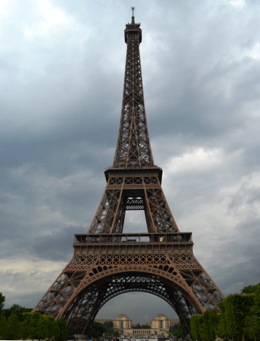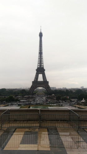 Дальше наша прогулка продолжалась по Елисейским полям, берущим свое начало с Площади Согласия. Здесь фотографий не будет, так как пришлось передвигаться под сенью деревьев, скрываясь от непрекращающегося ливня. Таким манером мы добрались до станции метро Champs Elisees, откуда доехали до станции Trocadero. Вышли у дворца Шайо и увидели великолепный вид на Эйфелеву башню: