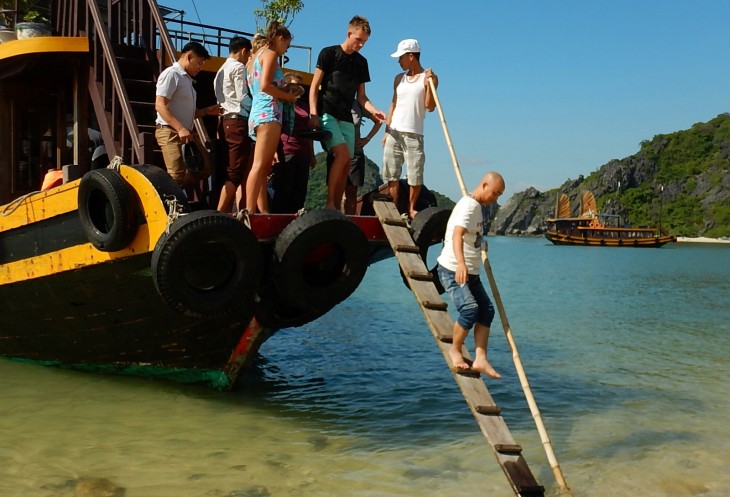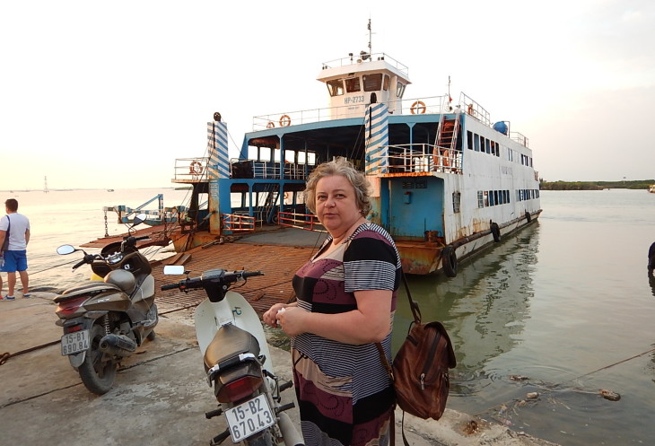 Мы уже смирились с опозданием на трансфер и потерей денег, пытаемся отдыхать через "не могу". А куда мы с острова денемся? Кораблик наш от берега отошел. Видно, были случаи контрабандного проникновения обезьян на корабли. И вдруг бежит наш не понимающий гид прижав телефон к уху, радостно машет руками в сторону маленького катерочка: Трансфер Ханой? Руси? Go! Go! Мы погрузились в катер, катер подошел к борту нашего кораблика, муж влез по опасным сходням на кораблик, забрал наши вещи, вернулся тем же небезопасным путем, и катерок помчал нас в сторону пирса. На рыбацком пирсе нас ждала машина и то же заклинание: Трансфер Ханой? Руси? Go! Go! Прыгнули в машину, через 10 минут были у отеля, наши рюкзаки ждали нас на рецепшн, а автобус напротив входа в отель. Из-за нас трансфер задержали на 30 минут. Приключение, однако! Вот и паромная переправа перед нами.