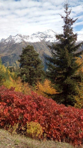 Первый трек до ледника Чалаади был очень приятным и довольно легким. В начале маршрута строительство ГЭС, строят турки для себя. Речка перерыта, переход по навесному мосту и тропа поднимается вдоль притока. Маршруты промаркированы. С погодой повезло, было солнечно, на тропе встретилась группа испанцев. Как красиво они были одеты в цветные вещи! И радостные, что всегда добавляет привлекательности.