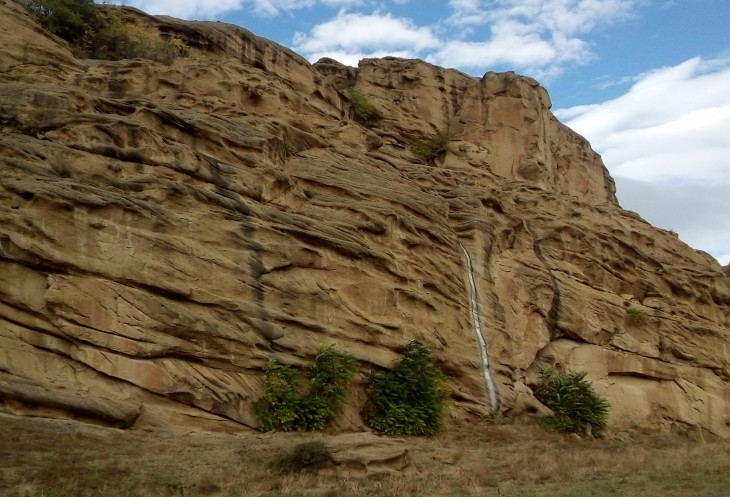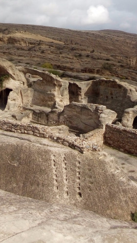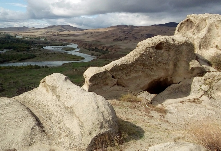 Любопытно, город высечен на месте грунтов, отличающихся от грунтов в соседней же долинке через ручей – приток Куры. Тут же за ручьем, более желтые, с оттенком охры, породы, а здесь более серая порода камня.